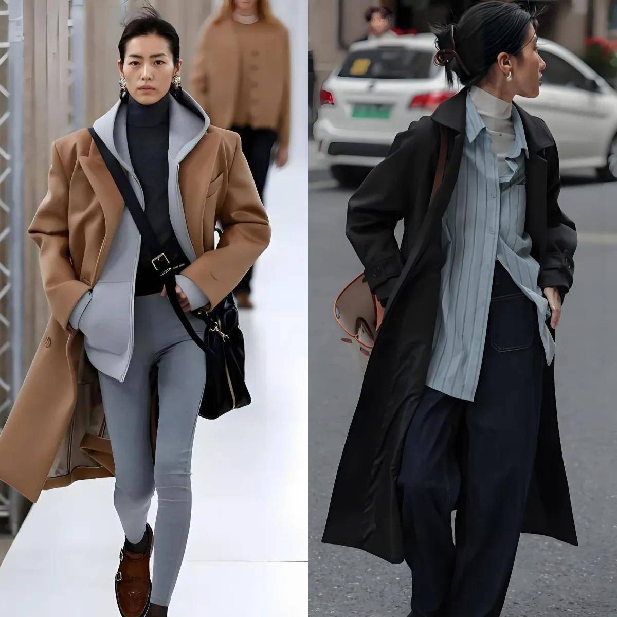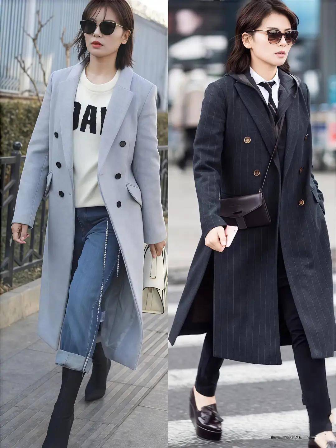 ②紧身裤vs阔腿裤:就算是超模,紧身裤配大衣也容易显得为德不终,等闲躯壳更是难以附近。与其踩雷,不如像右边博主那样禁受直筒阔腿牛仔裤——条纹衬衫叠穿白色竭诚毛衣,外搭玄色大衣,低调又大气,还能修饰腿型。
