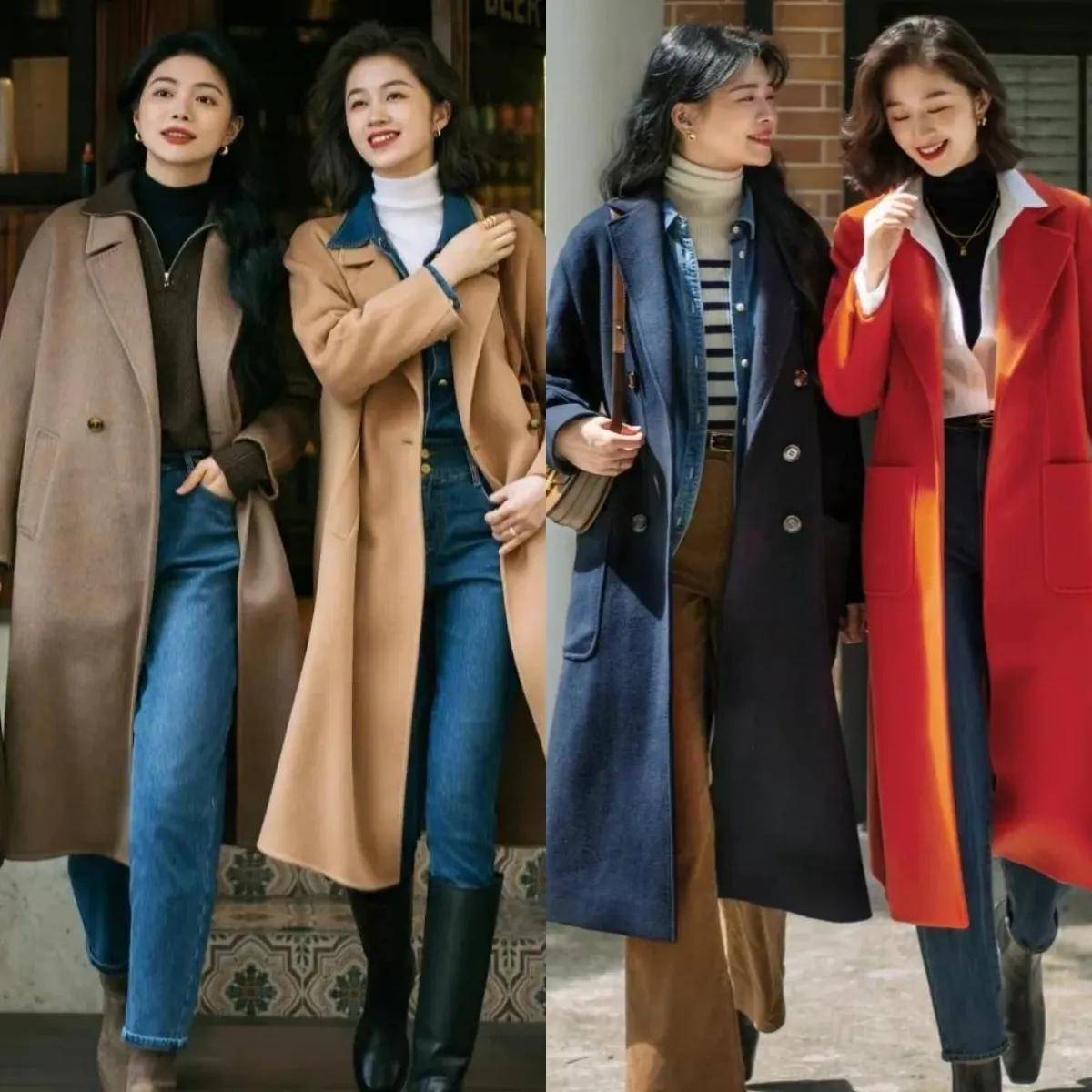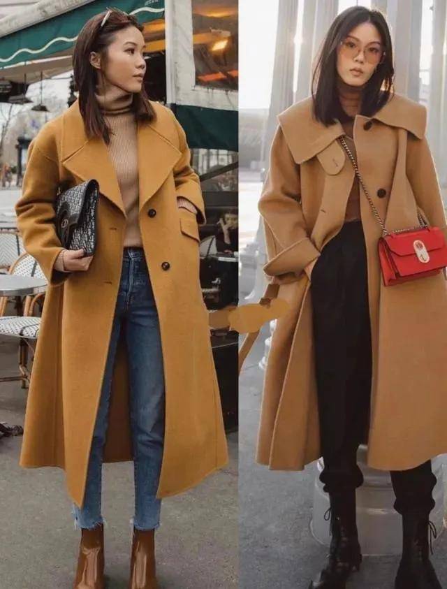 ④领子项目有认真:不同领型的大衣成果不同——X版型大衣搭配大翻领更显档次;敞穿时禁受小翻领则更利落。比如右边博主的X型大翻领大衣,内搭玄色竭诚毛衣,系上腰带勒出腰线,再配长筒靴,气质感拉满。