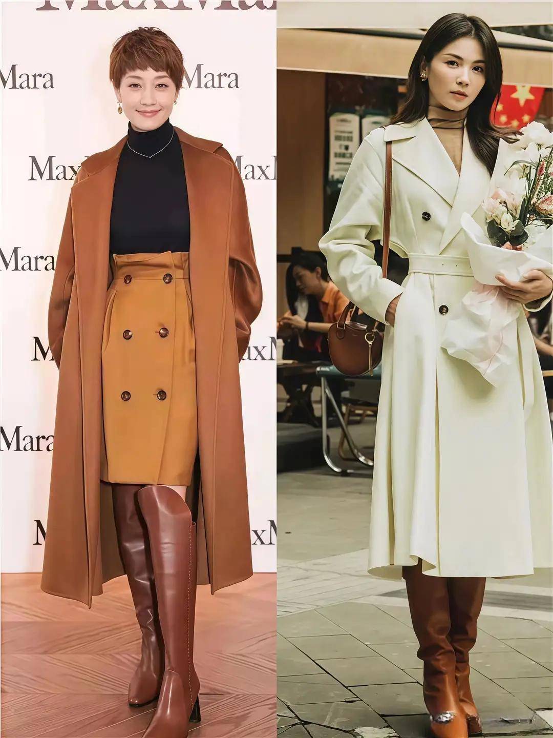 ③大衣+长筒靴:酷好意思兼具。长筒靴是冬季提高气质的利器,搭配大衣+裙子,既能蔓延腿部线条,又能打造轻熟御姐风,御寒又前锋。